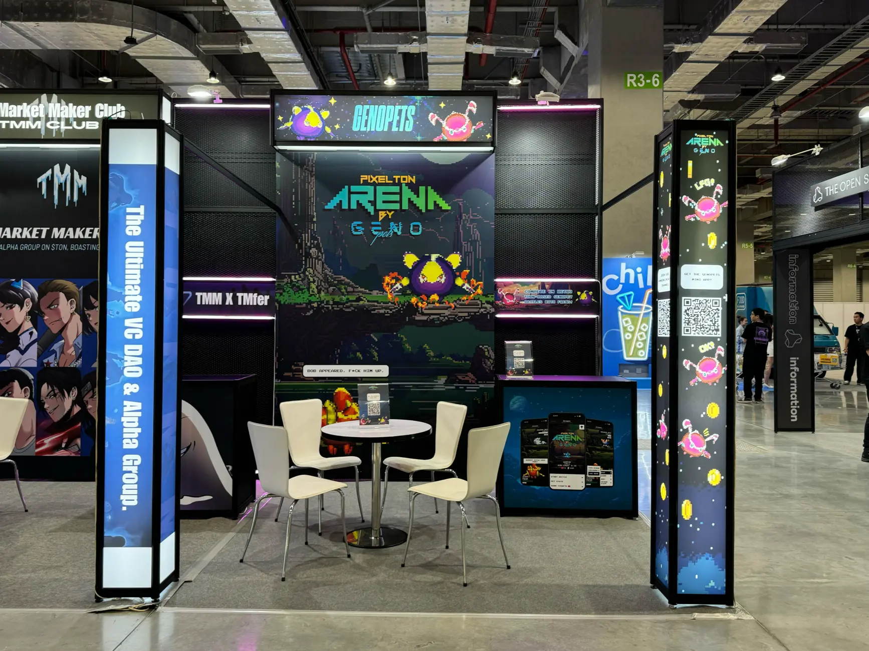 The visual direction for Pixelton Arena combined retro-inspired game art with a cohesive visual system that extended beyond gameplay. The pixel art style drew from classic Japanese RPGs and arcade games, creating a nostalgic yet modern aesthetic optimized for mobile and high-resolution displays. In addition to in-game visuals, the art direction supported player engagement and product growth through marketing touchpoints. This included Pixelton Arena sticker packs for Telegram, promotional videos, exclusive Genopets in-app item artwork, and event booth displays. Together, these assets reinforced the game’s identity across gameplay, social channels, and live events, ensuring a consistent visual experience throughout the player journey.